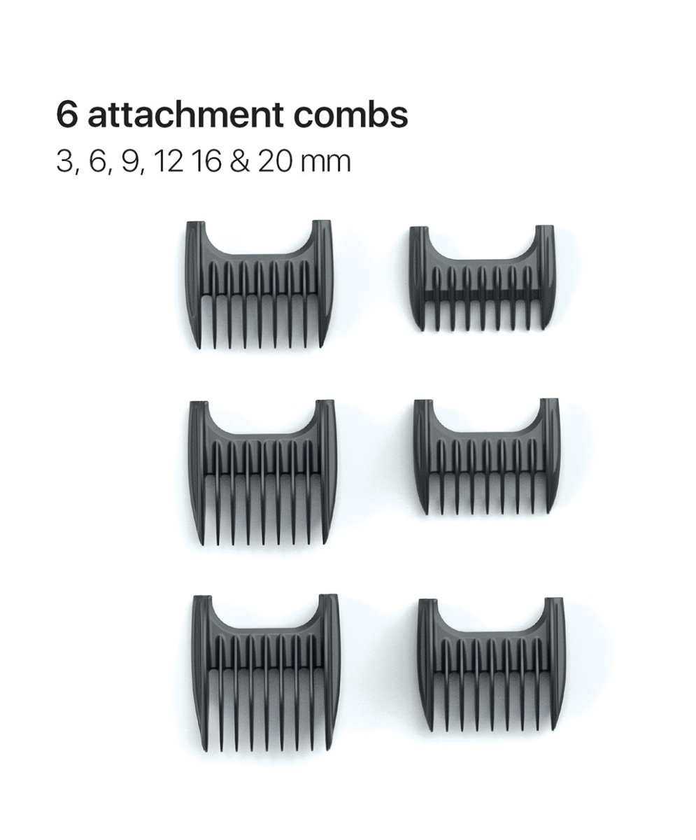5 ustawień długości strzyżenia (0,8; 1,3; 1,8; 2,4; 3,0 mm) oraz 6 nakładek (3, 6, 9, 12, 16 i 20 mm).